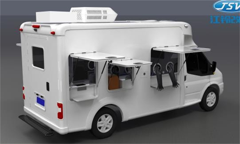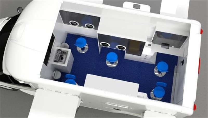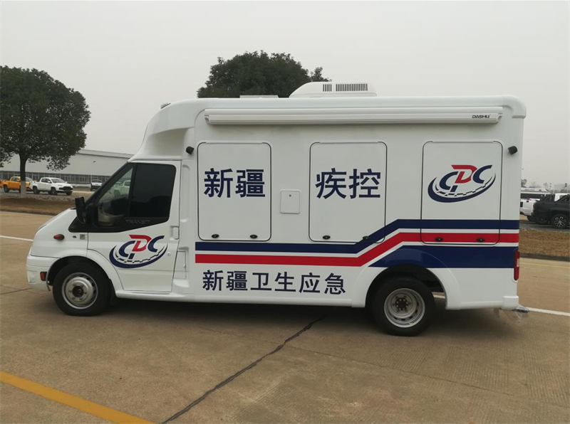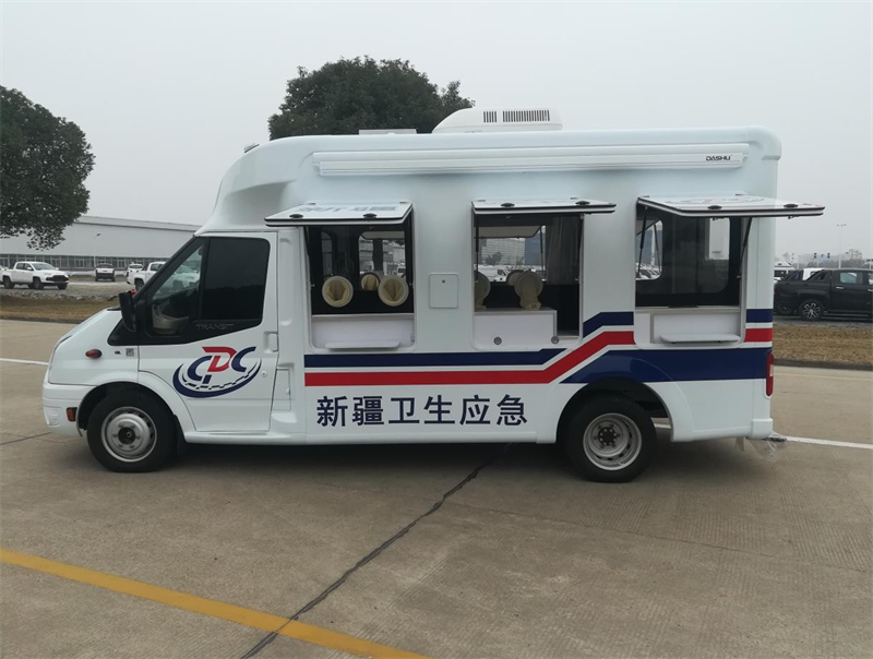 核酸检测采样车,采用江铃福特推出的福特新世代全顺加长轴轻型客车底盘改装。整车参考 PCR 检测实验室及移动实验室等相关行业标准,集成正压防护、温度调节、对讲、样品传递、车内消毒等功能,可迅速部署于户外,为群体核酸咽拭子采样、样品登记及样品整理提供有力支撑;在整个作业过程中确保医务工作人员与受检人员无直接接触,最大限度的保障了一线医务工作人员的作业安全,为新型冠状病毒核酸样本采集及样品整理提供了防护屏障及舒适的工作环境。