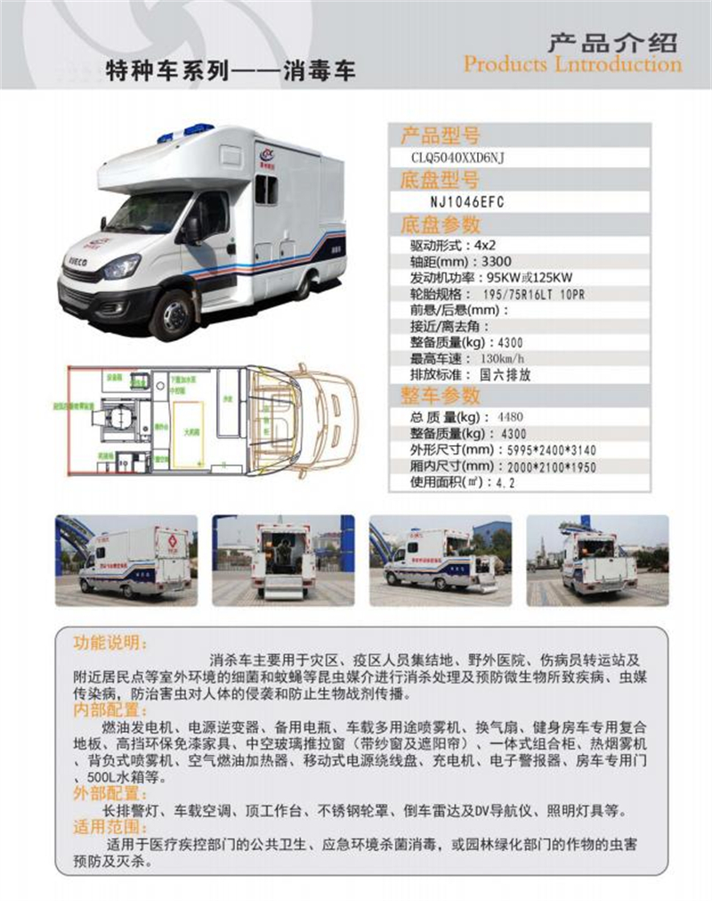 该车内装环保喷雾风机;主要用于流动消毒、杀菌、除臭等城乡卫生管理,卫生防疫消毒.ABS系统控制器型号:BOSCH ABS9、BOSCH ESP9, ABS系统控制器生产企业:BOSCH公司.装F1AE8481D发动机时,发动机最大净功率93KW;装F1CE8481K发动机时,发动机最大净功率123kW.侧防后防由车身专用装置替代,后部离地高度为500mm.选装后部不同样式. |