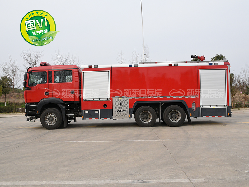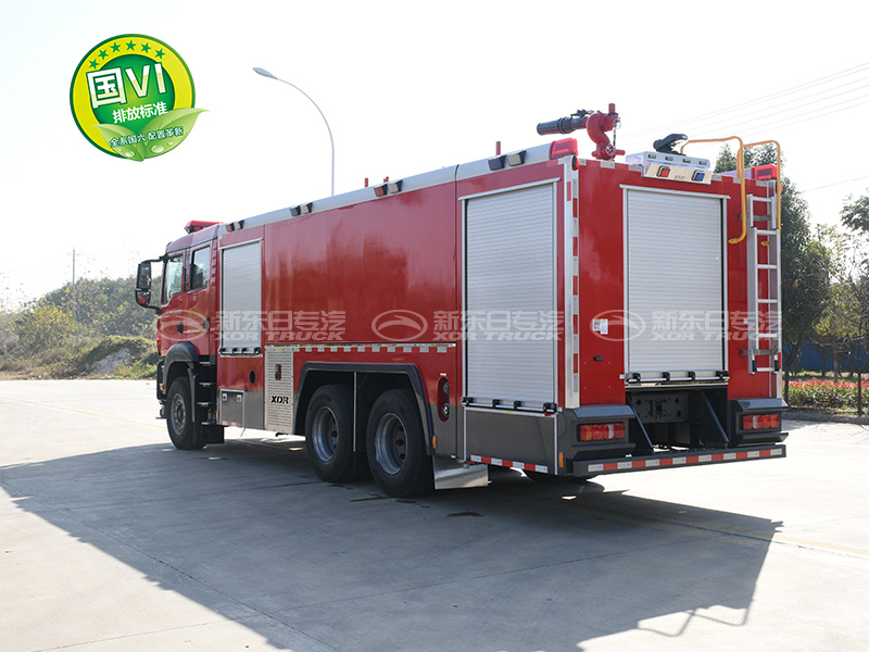 汕德卡后双桥15吨泡沫消防车是由二类汽车底盘、罐体、水泵、管路、仪表电路系统等部件组成,该车装配铝合金后爬梯(可拆卸),泵房在整车尾部,罐体为钢板焊接式,载液量15.0方(水12方/泡沫3方),水罐材质为优质碳钢板,水罐内部做防腐处理,泡沫罐为不锈钢材质。该车装备CB10/100常压消防泵,PLKD8/80两用消防炮。