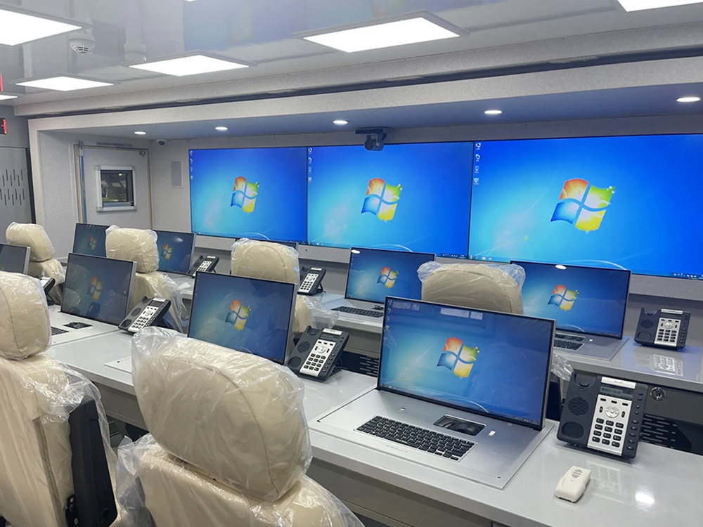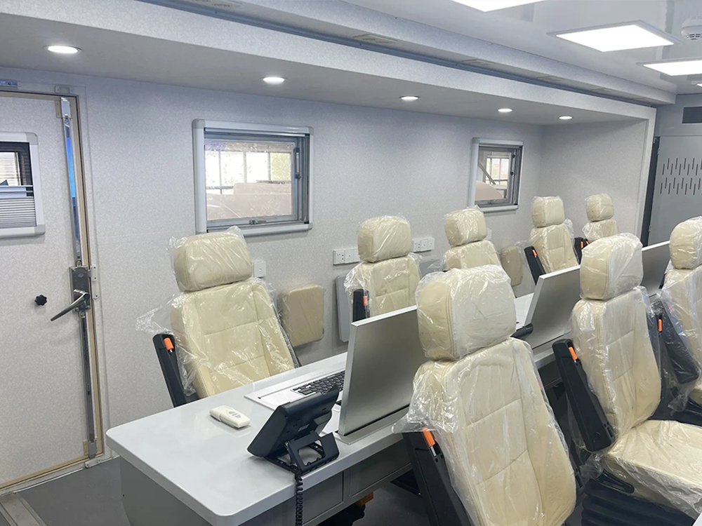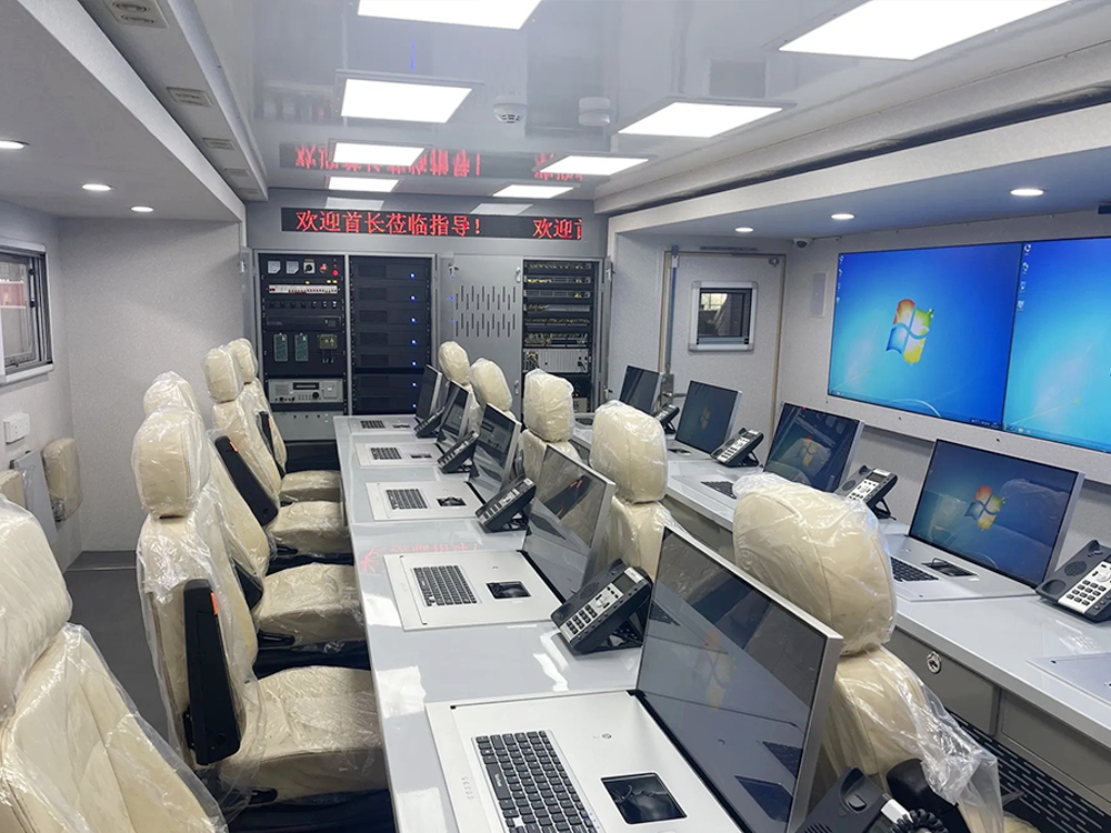 ②车内功能分区多样,具有现场会议系统、监控摄像系统、通信办公系统、视频矩阵系统等功能模块,同时可根据各类应急需求搭载微波通信系统、动中-通或静中-通卫星图传系统,实现实时应急通信的需求。