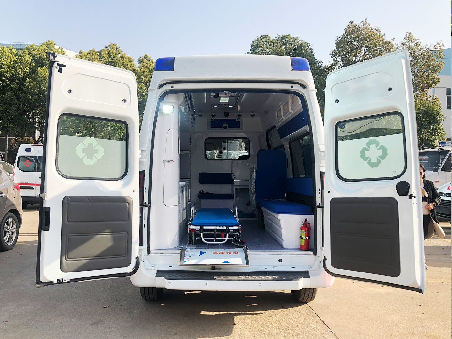 1、灭火器1个 2、输液滑轨1个及挂钩2个 3、顶部黄色安全扶手 4、污物桶 1 个 |