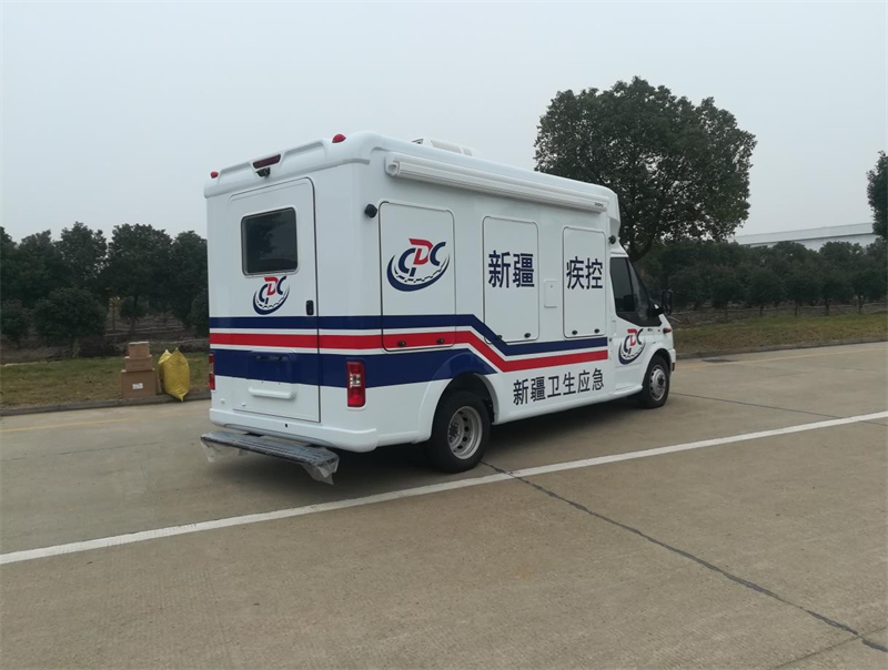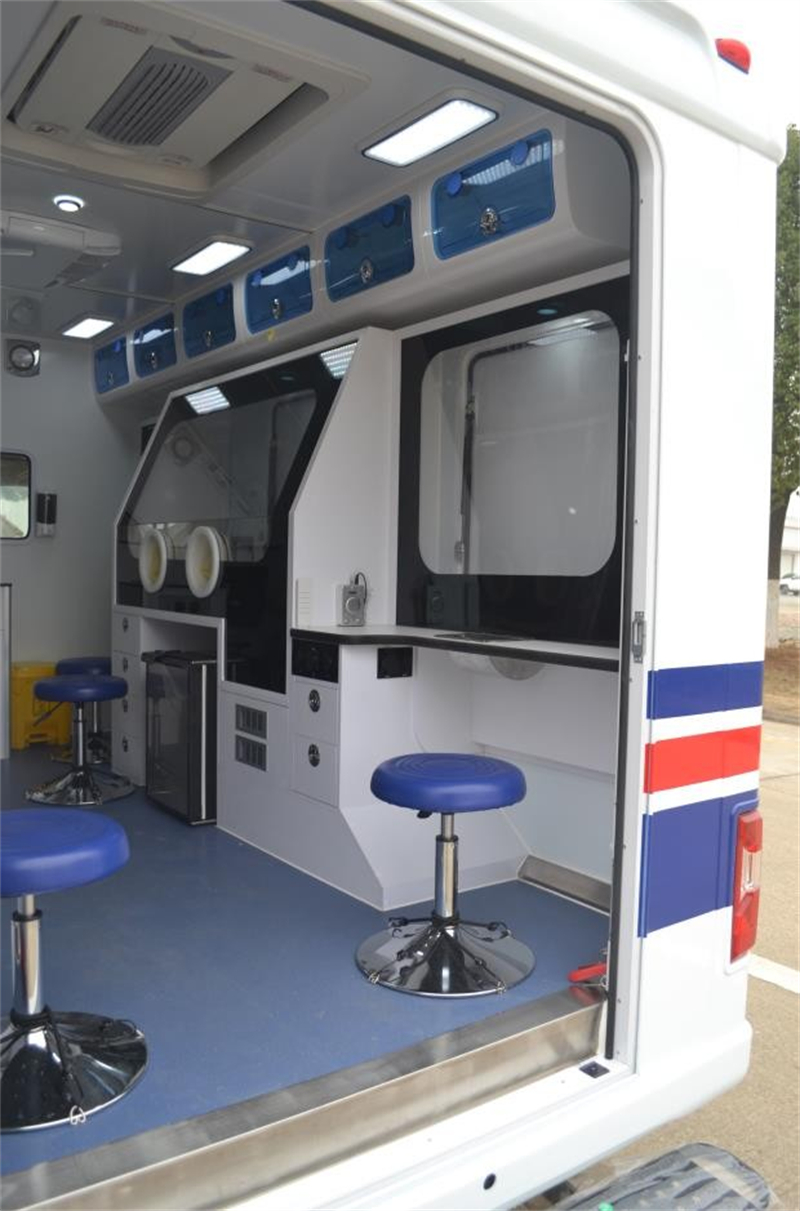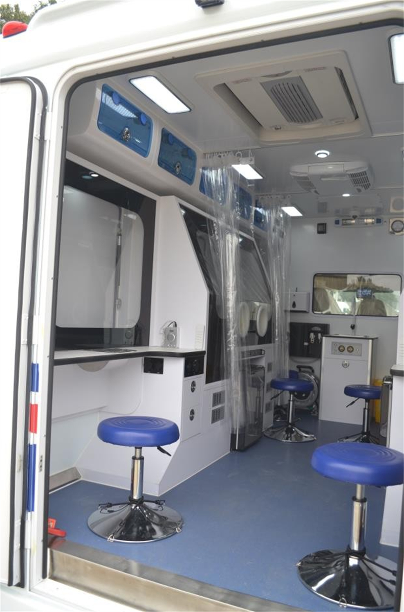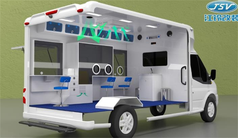 核酸检测采样车,采用江铃福特推出的福特新世代全顺加长轴轻型客车底盘改装。整车参考 PCR 检测实验室及移动实验室等相关行业标准,集成正压防护、温度调节、对讲、样品传递、车内消毒等功能,可迅速部署于户外,为群体核酸咽拭子采样、样品登记及样品整理提供有力支撑;在整个作业过程中确保医务工作人员与受检人员无直接接触,最大限度的保障了一线医务工作人员的作业安全,为新型冠状病毒核酸样本采集及样品整理提供了防护屏障及舒适的工作环境。
