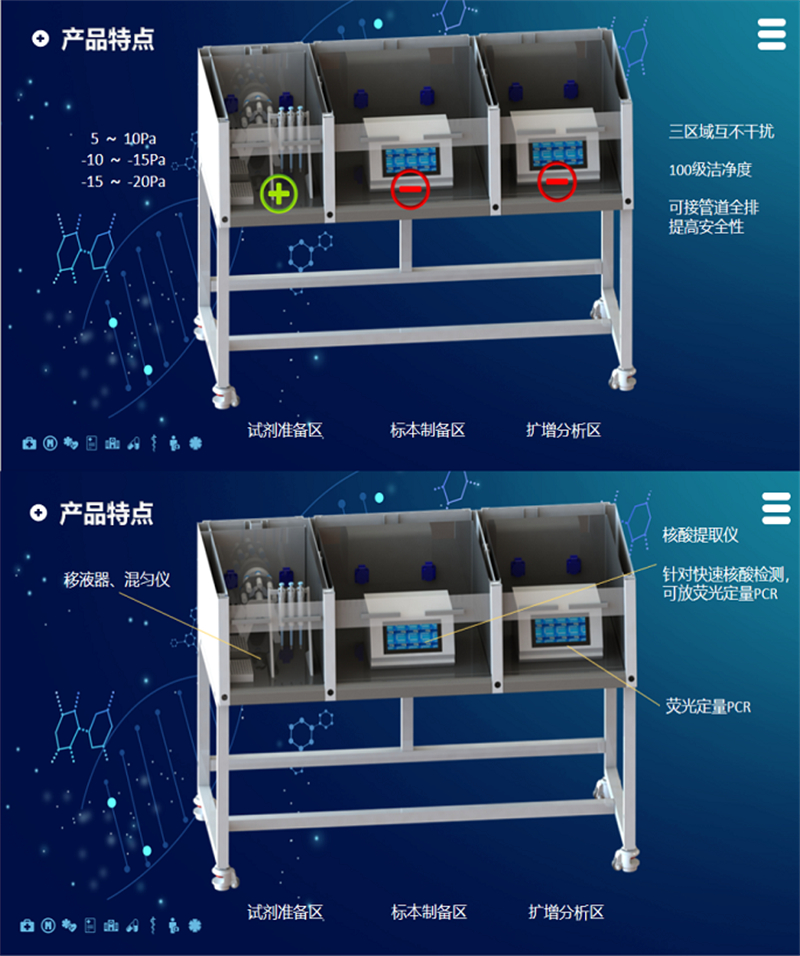 该设备分为三个区域,分别为试剂准备区,标本制备区和扩增分析区。三个区域紧靠设计,又互不干扰,保证了各个检测环节的安全性,减少各区域间样品传递时间,提高快速核酸检测效率。 |