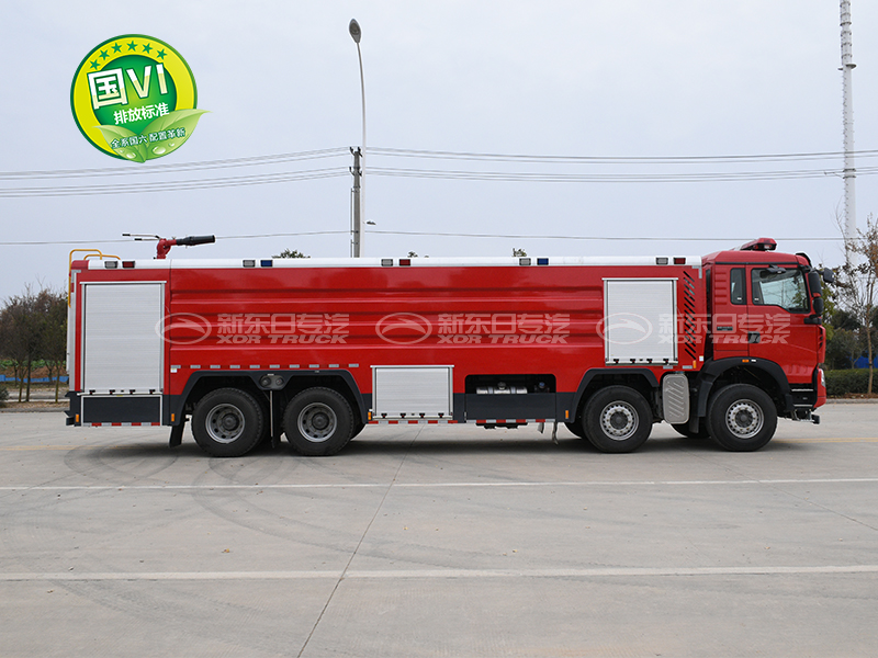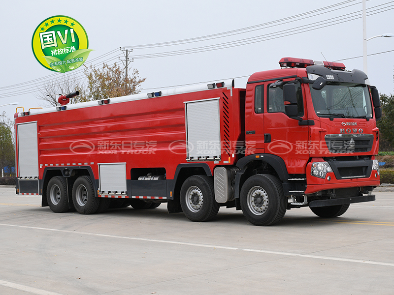 重汽豪沃前四后八24吨泡沫消防车是由二类汽车底盘、罐体、水泵、管路、仪表电路系统等部件组成,该车装配铝合金后爬梯(可拆卸),泵房在整车尾部,罐体为钢板焊接式,载液量24.0方(水20方/泡沫4方),水罐材质为优质碳钢板,水罐内部做防腐处理,泡沫罐为不锈钢材质。该车装备CB10/100常压消防泵,PL8/80两用消防炮。