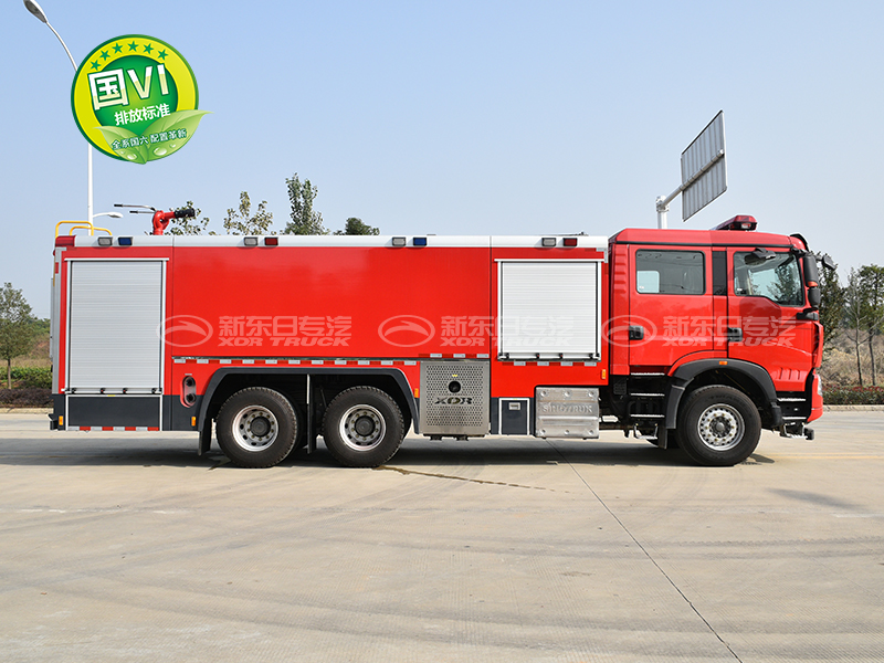 重汽豪沃TX7后双桥17吨泡沫消防车是由二类汽车底盘、罐体、水泵、管路、仪表电路系统等部件组成,该车装配铝合金后爬梯(可拆卸),泵房在整车尾部,罐体为钢板焊接式,载液量17.0方(水14.5方/泡沫2.5方),水罐材质为优质碳钢板,水罐内部做防腐处理,泡沫罐为不锈钢材质。该车装备CB10/80常压消防泵,PL8/64两用消防炮。