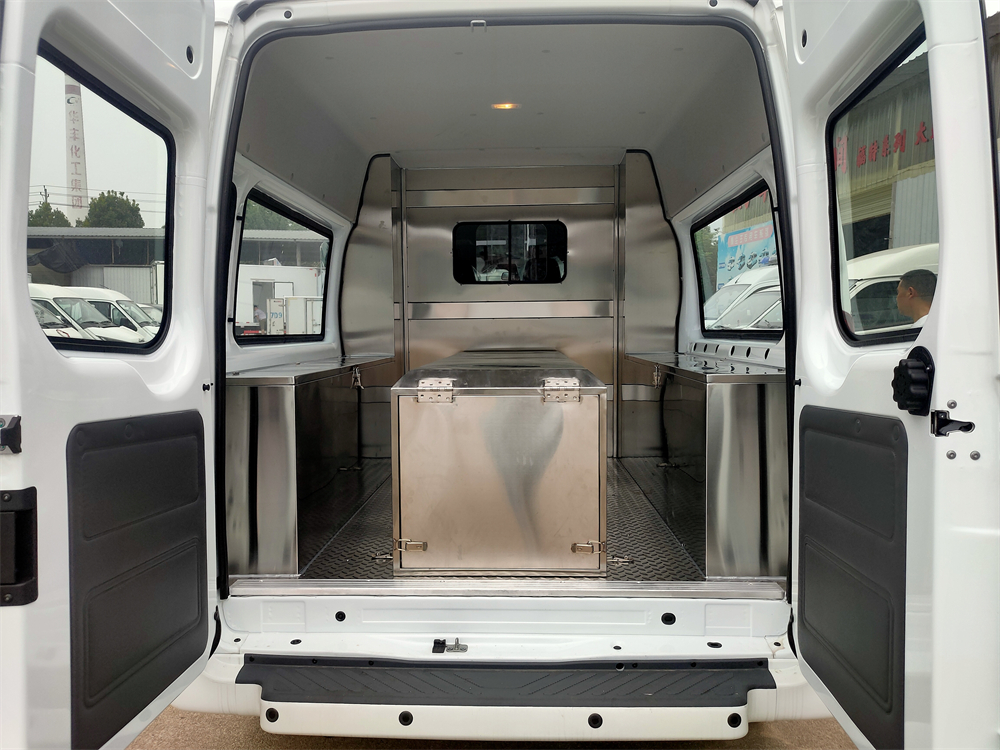 1、采用304D不锈钢加厚材料制作中隔墙(带可滑玻璃窗),方便随时观察后仓 2、有不锈钢工具箱,可放置随车用品 3、前后包铺304D不锈钢花纹底板 4、选配304D不锈钢常温尸棺及担架一副或304D车载制冷棺 5、可根据不同需求进行改装 |