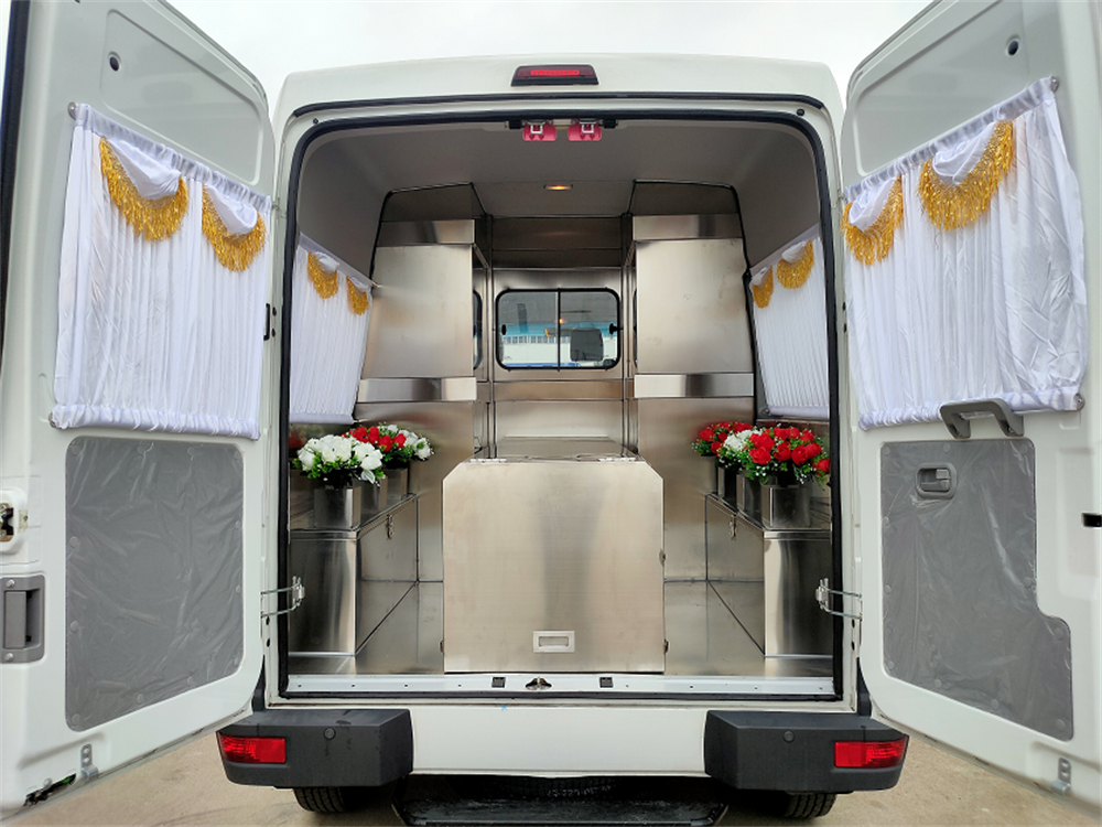 1、采用304D不锈钢加厚材料制作中隔墙(带可滑玻璃窗),方便随时观察后仓 2、有不锈钢工具箱,可放置随车用品 3、前后包铺304D不锈钢花纹底板 4、选配304D不锈钢常温尸棺及担架一副或304D车载制冷棺 5、可根据不同需求进行改装 |